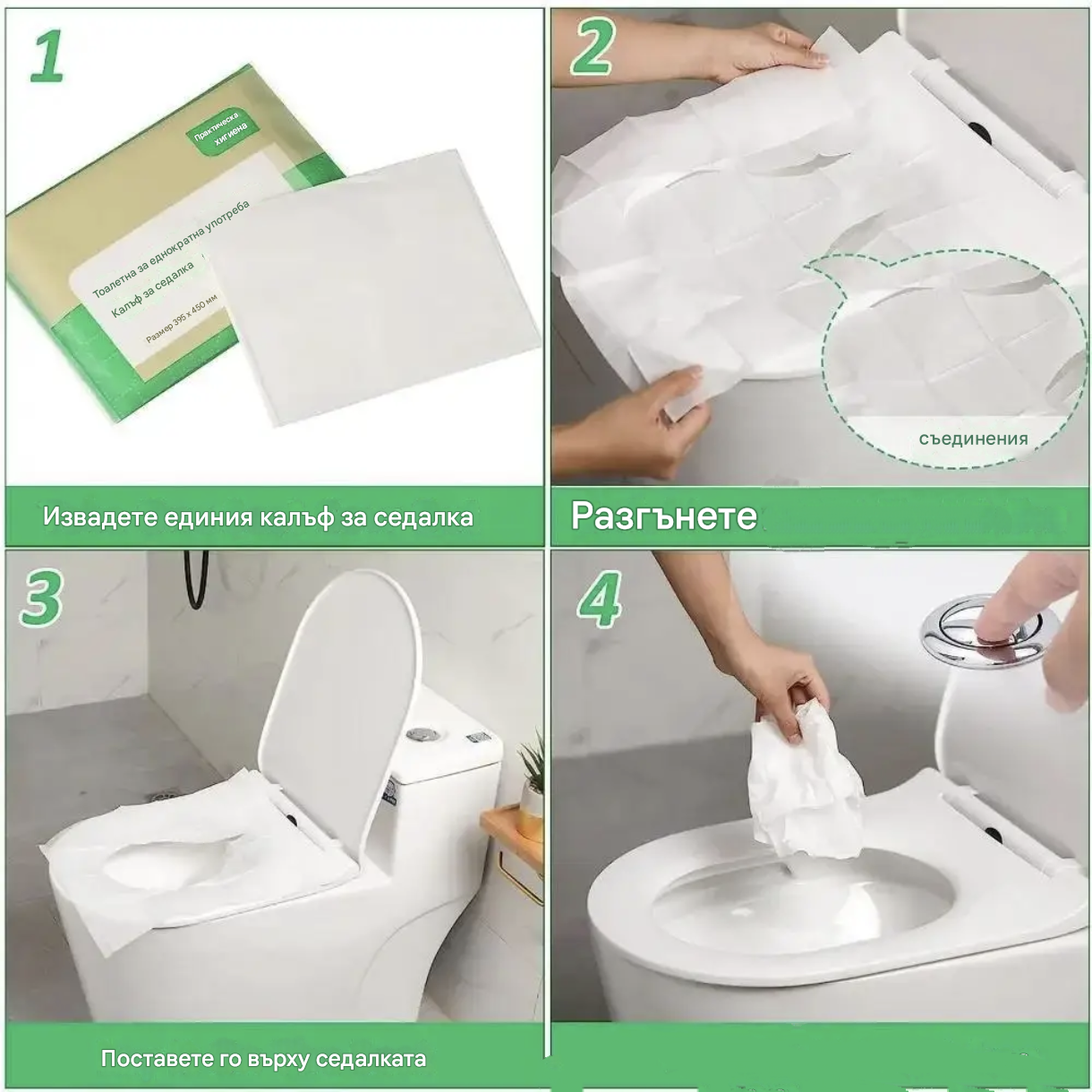 Тези еднократни тоалетни калъфи са идеалното решение за хигиенично и удобно използване на обществени тоалетни. Екологичният материал и безопасният дизайн ги правят подходящи за всеки, който цени чистотата и околната среда.