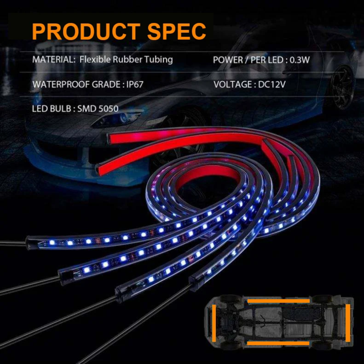 Тази LED лента за под автомобил създава уникална и впечатляваща атмосфера, като светлината може да бъде в синхрон с баса на музиката в колата. С Bluetooth връзка и специално мобилно приложение можете лесно да избирате различни цветове и режими на осветление, за да персонализирате визията на вашето превозно средство.